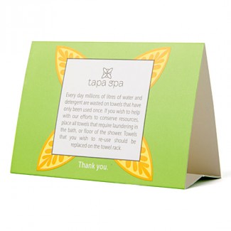 Front: Every day millions of litres of water and detergent are wasted on towels that have only been used once. If you wish to help with our efforts to conserve resources, place all towels that require laundering in the bath, or floor of the shower. Towels that you wish to re-use should be replaced on the towel rack.
